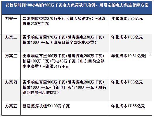《報告》假設(shè)山東省存在500萬千瓦的尖峰負(fù)荷供應(yīng)缺口,設(shè)定5種電力供應(yīng)保障方案,通過計算這5種方案不同的負(fù)荷持續(xù)時間的資源年化總成本來比較不同方案的經(jīng)濟性。研究結(jié)果顯示,以持續(xù)時間100小時的500萬千瓦電力負(fù)荷缺口為例, “需求響應(yīng)(270萬千瓦)+延壽煤電(230萬千瓦)”方案的年化成本最低,為3.25億元;“新建燃煤機組5x100萬千瓦”方案的年化成本最高,為17.55億元,其中固定成本高達(dá)16億元。
