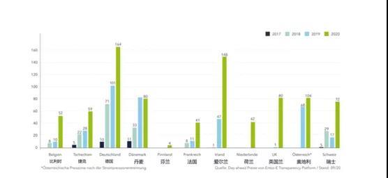歐洲各國都出現(xiàn)過負(fù)電價,而且是逐年增多。德國2019年有101小時出現(xiàn)過負(fù)電價,2020年9月份已經(jīng)達到164小時。