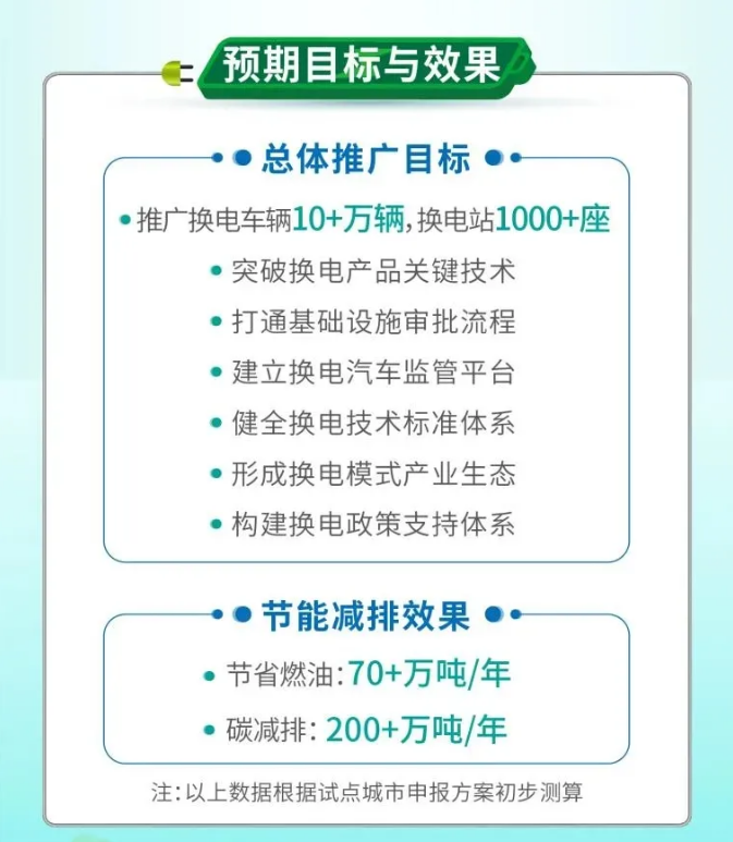根據(jù)《通知》,本次試點總體推廣目標(biāo)為推廣換電車輛10+萬輛、換電站1000+座,其中包括突破換點產(chǎn)品關(guān)鍵技術(shù),打通基礎(chǔ)設(shè)施審批流程,建立換電汽車監(jiān)管平臺,健全換電技術(shù)標(biāo)準(zhǔn)體系,形成換電模式產(chǎn)業(yè)生態(tài),構(gòu)建換電政策支持體系。在節(jié)能減排方面,力爭達(dá)到節(jié)省燃油70+萬噸/年、碳減排200+萬噸/年。