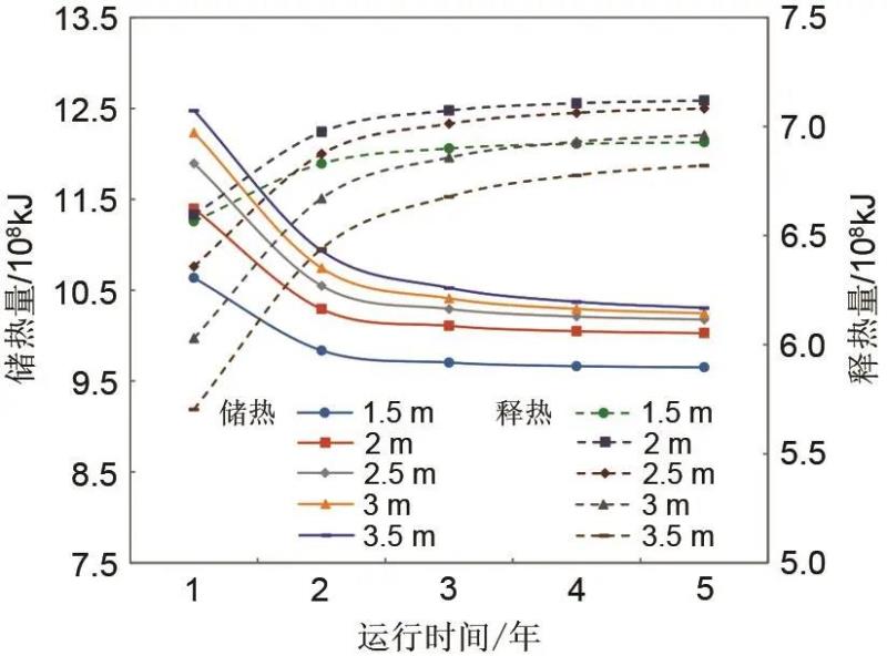 進一步地,圖13為不同層間距下系統(tǒng)儲/釋熱量的變化情況。其中,儲熱量隨著層間距的增加而增加,從1.5 m增加到2 m時儲熱量增加最大;層間距從1.5 m增加到2 m時,釋熱量增加,層間距從2 m增加到3.5 m時,釋熱量逐漸降低。