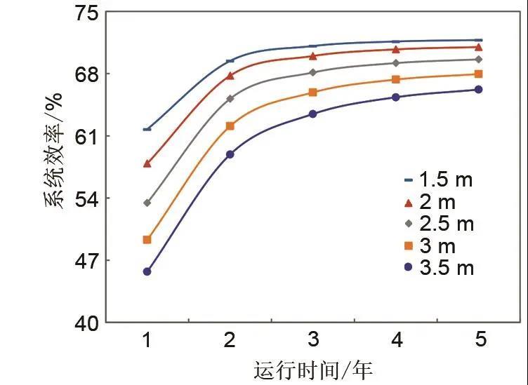 由圖可知,隨著運行年限的增加,不同層間距的系統(tǒng)效率變化趨勢相一致,表明儲熱體逐漸飽和。隨著層間距的增加,系統(tǒng)效率逐漸降低。因為層間距增加,加大了儲熱體土壤體積,從而降低了儲熱溫度,不利于釋熱的進行。