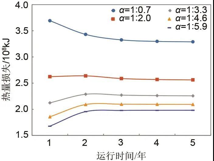 不同規(guī)模匹配下復(fù)合儲熱體的熱量損失如圖8所示,由圖可知,隨著α的增加,復(fù)合儲熱體熱量損失也增加,α從1∶2增加到1∶0.7時,熱損增幅最大,這是因為α的增加,導(dǎo)致水箱體積增大,土壤有效容積被壓縮,地埋管層間距變小,地埋管更靠近水箱,使儲熱體溫度增加明顯,熱損隨之增加。