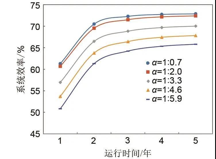 復(fù)合儲熱體不同規(guī)模匹配下系統(tǒng)效率變化情況如圖7所示。可以看出,系統(tǒng)效率均隨著運行年限的增長而逐漸增加,并呈現(xiàn)趨于平緩的變化趨勢。α=1∶5.9時,系統(tǒng)效率最低,隨著α的增加,系統(tǒng)效率逐漸上升,α上升到1∶0.7時,系統(tǒng)運行至第5年的效率可達72.9%,但水箱體積占比增加,會大幅增加投資成本,α=1∶2時,運行至第5年系統(tǒng)效率達72.4%,接近α=1∶0.7時的效率值。