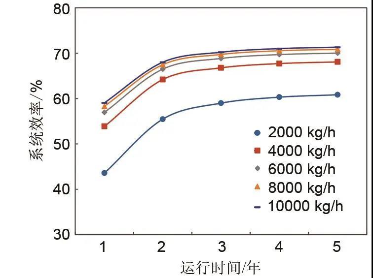 由圖6可知,不同質(zhì)量流量下的系統(tǒng)效率均隨著運行年限的增長而逐漸增加,并呈現(xiàn)趨于平緩的變化趨勢。其中,質(zhì)量流量2000 kg/h條件下第1年的系統(tǒng)效率僅為43.6%,到第3年上升到59.0%,隨后兩年緩慢上升到60.8%;質(zhì)量流量6000 kg/h條件下第1年的系統(tǒng)效率為56.9%,到第3年上升到68.8%,隨后兩年緩慢上升到70.0%。可以看出,隨著質(zhì)量流量的增加,系統(tǒng)效率也逐漸增加,但增加的幅度越來越小。