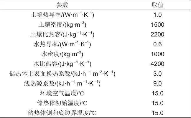 參考我國某地供暖時間,采用儲熱3個月,保溫3個月,釋熱3個月,恢復(fù)3個月的運行方式。土壤和水箱初始溫度均為15 ℃,儲熱入口溫度為80 ℃,釋熱入口溫度為15 ℃,模擬計算時間步長為0.5 h。儲熱體基準熱物性參數(shù)設(shè)置見表1。