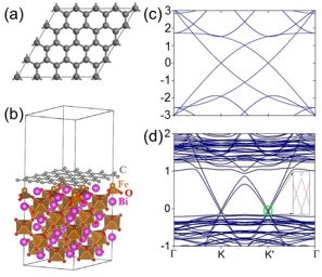 圖 1:(a) 4x4的石墨烯超元胞;(b) 4x4的石墨烯超元胞置于鐵鉍酸的(111)鐵磁面上;(c) 對應(yīng)于圖(a)的石墨烯能帶圖[狄拉克點無能隙];(d) 對應(yīng)于圖(b)的能帶圖[狄拉克點打開一個量子反常霍爾效應(yīng)體能隙]。