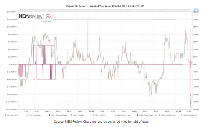如下圖所示(由NEM Review的Paul McArdle提供),該儲(chǔ)能項(xiàng)目在早上8點(diǎn)之后以205MW的裝機(jī)容量進(jìn)行充電,然后在短時(shí)間內(nèi)以250MW的裝機(jī)容量放電,從而深入了解其對當(dāng)?shù)仉娋W(wǎng)和批發(fā)市場的潛在影響。