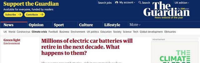 英國《衛(wèi)報》報道截圖 據估計,至2030年,預計將有超過1200萬噸鋰離子電池“退休”。這些電池生產需要大量的鋰、鎳和鈷等原材料,這些原材料的開采會對氣候、環(huán)境以及勞工權利產生影響,同時,當這些電池超過使用壽命,還可能變成堆積如山的電子垃圾。