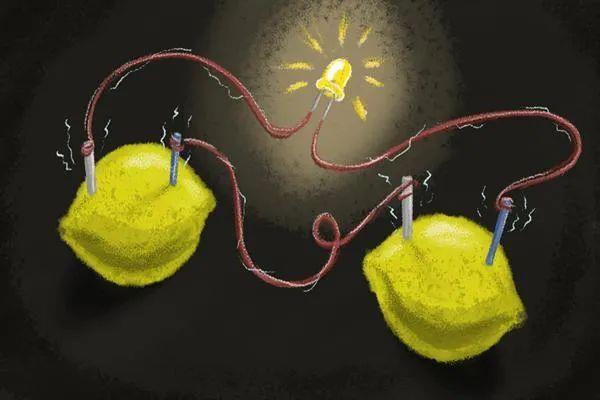 早在1800年,歷史上第一個電池就被亞歷山德羅·伏特(Alessandro Volta)發(fā)明了出來。它由幾組電池串聯(lián)而成,可以形象地看作是電池組的堆疊,而被稱為“伏打電堆”。這項發(fā)明奠定了電池結(jié)構(gòu)的基礎——兩個電極、電解質(zhì),再加上連接兩個電極的外電路。而我們熟悉的一個化學實驗——水果電池,就是模擬了最原始的伏打電堆:將鋅片和銅片當作兩個電極插入一個檸檬中,以檸檬中的酸為電解質(zhì),外加連接小燈的導線,我們就能看到燈變亮,對應著水果電池的放電。