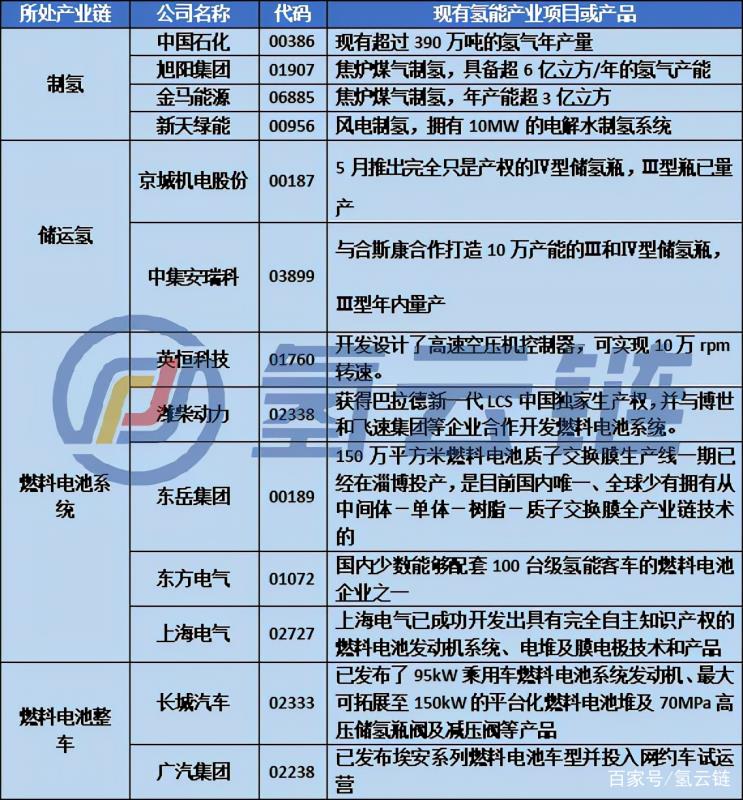 氫云鏈獲悉,億華通此前關(guān)于公司籌劃發(fā)行H股股票并在香港上市相關(guān)事項(xiàng)的提示性公告。目前,在港股上市的涉氫概念股有13家,幾乎涵蓋了整個氫能產(chǎn)業(yè)鏈,相關(guān)情況如下圖所示。