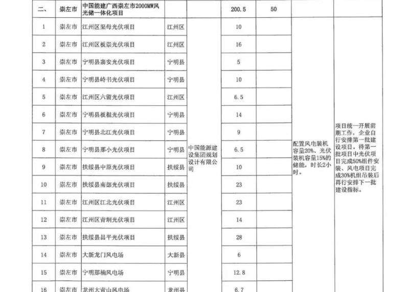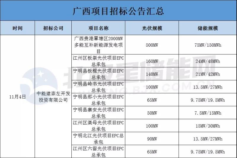 11月4日,中能建崇左開(kāi)發(fā)投資有限公司連續(xù)發(fā)布9個(gè)招標(biāo)項(xiàng)目,儲(chǔ)能配置比例都為15%×2h,共配置儲(chǔ)能規(guī)模達(dá)189MW/378MWh。這9個(gè)項(xiàng)目分別是中國(guó)能建廣西貴港覃塘區(qū)2000MW多能互補(bǔ)新能源發(fā)電項(xiàng)目、江州區(qū)板崇光伏項(xiàng)目EPC總承包、寧明縣板棍光伏項(xiàng)目EPC總承包、寧明縣峙書光伏項(xiàng)目EPC總承包、寧明縣那小光伏項(xiàng)目EPC總承包、寧明縣寨安光伏項(xiàng)目EPC總承包、江州區(qū)渠母光伏項(xiàng)目EPC總承包、寧明北江光伏項(xiàng)目EPC總承包、江州區(qū)六留光伏項(xiàng)目EPC總承包。并且都位列于之前10月9日,廣西壯族自治區(qū)能源局印發(fā)《2021年市場(chǎng)化并網(wǎng)陸上風(fēng)電、光伏發(fā)電及多能互補(bǔ)一體化項(xiàng)目建設(shè)方案的通知》之中。