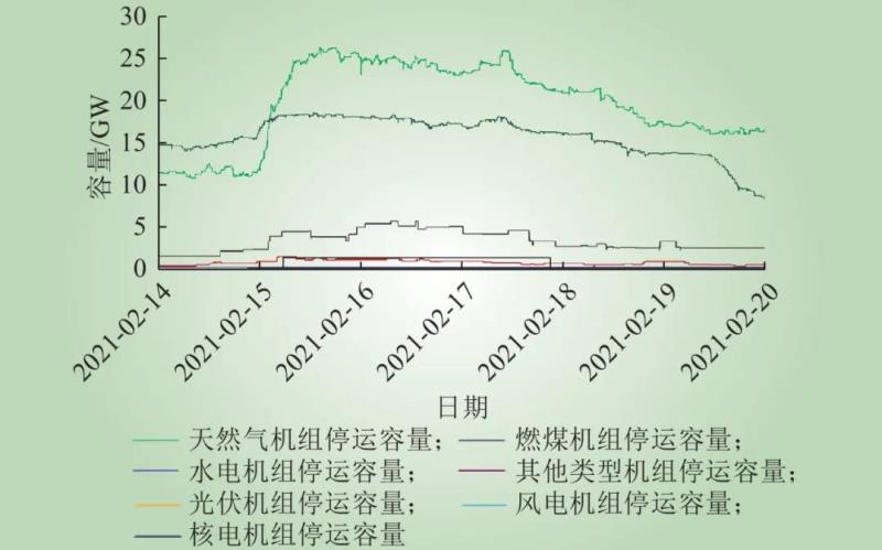 Fig.7 The shutdown generation capacity of each type of unit in Texas from 2/14 to 2/20