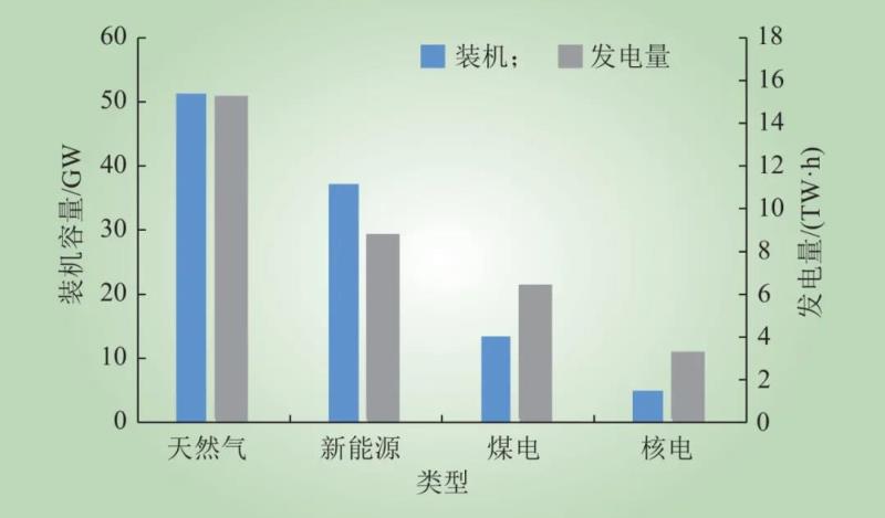圖1 2020年美國電源裝機(jī)和發(fā)電量結(jié)構(gòu)