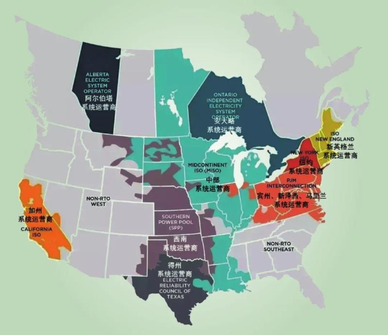 第二級是電力調(diào)度機(jī)構(gòu),負(fù)責(zé)各自區(qū)域的電力供需平衡,以保持電網(wǎng)穩(wěn)定。北美地區(qū)包括9家系統(tǒng)運(yùn)營商(區(qū)域系統(tǒng)運(yùn)營商(regional transmission organizations,RTO)、獨(dú)立系統(tǒng)運(yùn)營商(independent system organizations,ISO)) [6],如圖3所示,除負(fù)責(zé)各自轄區(qū)內(nèi)的電網(wǎng)調(diào)度和電力實(shí)時(shí)平衡外,還負(fù)責(zé)該區(qū)域內(nèi)的市場運(yùn)營。