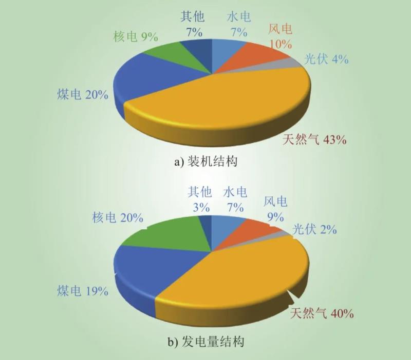 自2000年以來,隨著美國“頁巖氣革命”的成功,美國電網(wǎng)的電源結(jié)構(gòu)逐漸從以燃煤發(fā)電為主向以天然氣發(fā)電為主過渡。截至2020年年底,美國天然氣發(fā)電裝機(jī)容量達(dá)到4.8億kW。2020年天然氣發(fā)電量達(dá)到1.6萬億kW·h。2020年美國電源裝機(jī)和發(fā)電量結(jié)構(gòu)[1]如圖1所示。