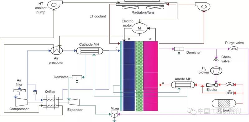 圖3 阿貢(Argonne)2009年質(zhì)子交換膜燃料電池配置體系。HT:高溫;LT:低溫;MH:膜增濕器