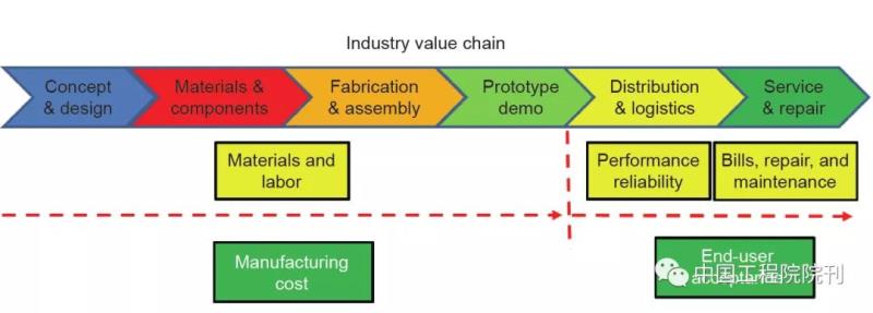 一項新的產(chǎn)品要先在實驗過程中達(dá)到經(jīng)濟(jì)和技術(shù)上的目標(biāo),然后再根據(jù)合理設(shè)計的指標(biāo),在完善的體系內(nèi)進(jìn)行大規(guī)模生產(chǎn)。制造過程的生命周期和價值鏈代表了產(chǎn)品的生產(chǎn)過程和成本,如圖2所示。燃料電池組的技術(shù)經(jīng)濟(jì)生命周期可分為兩個主要的階段:制造階段和最終用戶階段。