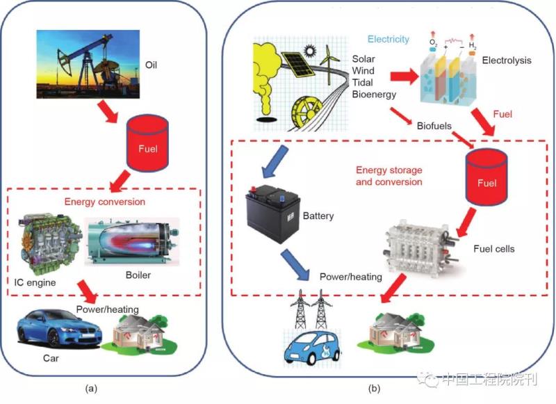 圖1 能源經(jīng)濟(jì)。(a)化石燃料能源經(jīng)濟(jì);(b)可再生能源經(jīng)濟(jì)