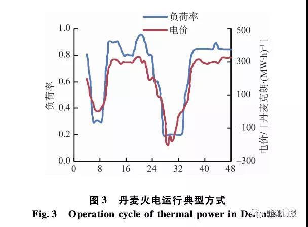 德國、丹麥火電靈活性情況見表2,目前在丹麥、德國,硬煤火電機(jī)組最小出力可達(dá)25%~30%,褐煤機(jī)組最小出力可達(dá)40%~50%,爬坡速率可分別達(dá)到4%/min~6%/min和2.5%/min~4%/min。在電力現(xiàn)貨市場中,這些機(jī)組往往根據(jù)電價(jià)信號及時(shí)調(diào)整自身出力,在低電價(jià)甚至負(fù)電價(jià)時(shí)降低出力甚至停機(jī),以獲得更優(yōu)的市場回報(bào),其火電運(yùn)行典型方式如圖3所示。