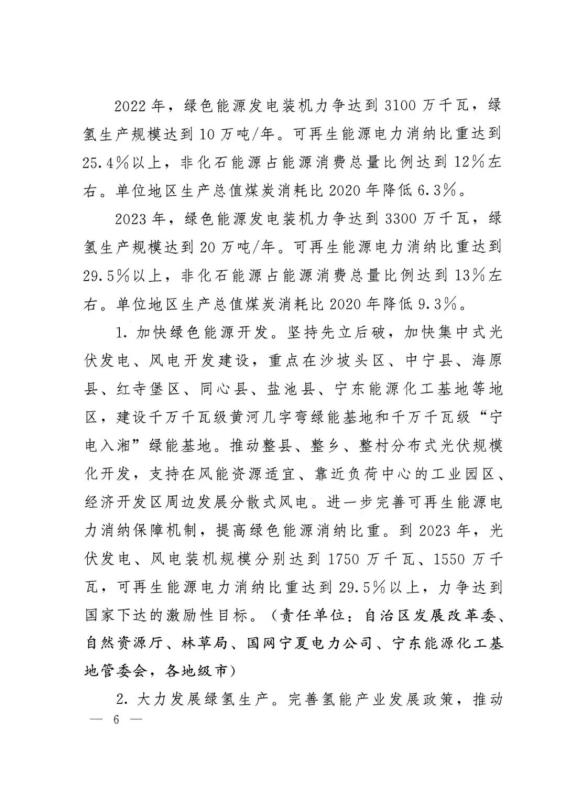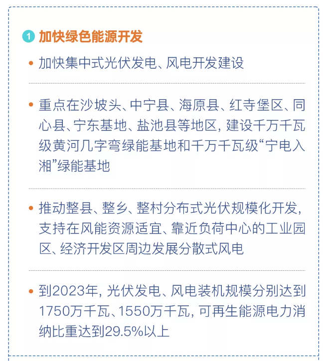 1、加快綠色能源開發(fā)。堅(jiān)持先立后破,加快集中式光伏發(fā)電、風(fēng)電開發(fā)建設(shè),重點(diǎn)在沙坡頭區(qū)、中寧縣、海原縣、紅寺堡區(qū)、同心縣、鹽池縣、寧東能源化工基地等地區(qū),建設(shè)千萬千瓦級(jí)黃河幾字彎綠能基地和千萬千瓦級(jí)“寧電入湘”綠能基地。推動(dòng)整縣、整鄉(xiāng)、整村分布式光伏規(guī)?;_發(fā),支持在風(fēng)能資源適宜、靠近負(fù)荷中心的工業(yè)園區(qū)、經(jīng)濟(jì)開發(fā)區(qū)周邊發(fā)展分散式風(fēng)電。進(jìn)一步完善可再生能源電力消納保障機(jī)制,提高綠色能源消納比重。到2023年,光伏發(fā)電、風(fēng)電裝機(jī)規(guī)模分別達(dá)到1750萬千瓦、1550 萬千瓦,可再生能源電力消納比重達(dá)到 29.5%以上,力爭達(dá)到國家下達(dá)的激勵(lì)性目標(biāo)。