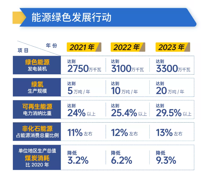 2023年,綠色能源發(fā)電裝機(jī)力爭達(dá)到3300萬千瓦,綠氫生產(chǎn)規(guī)模達(dá)到20萬噸/年。可再生能源電力消納比重達(dá)到29.5%以上,非化石能源占能源消費(fèi)總量比例達(dá)到13%左 右。單位地區(qū)生產(chǎn)總值煤炭消耗比2020年降低9.3%。
