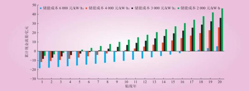 另外,隨著儲(chǔ)能技術(shù)經(jīng)濟(jì)性以及安全性的不斷進(jìn)步,核電站聯(lián)合儲(chǔ)能系統(tǒng)進(jìn)行調(diào)峰可有效彌補(bǔ)核電調(diào)峰深度有限、調(diào)峰靈活性較差等不足。目前,在給定技術(shù)路線的前提下,制約“核儲(chǔ)聯(lián)調(diào)”模式發(fā)展的關(guān)鍵因素是儲(chǔ)能系統(tǒng)的容量配置及其對(duì)應(yīng)的經(jīng)濟(jì)性問(wèn)題。首先,需要根據(jù)系統(tǒng)調(diào)峰需求(包括對(duì)核電機(jī)組的調(diào)峰深度及調(diào)峰時(shí)長(zhǎng)的要求),確定調(diào)峰關(guān)鍵參數(shù),從而確定儲(chǔ)能功率及容量大小。其次,儲(chǔ)能系統(tǒng)的全壽命周期經(jīng)濟(jì)性需考慮儲(chǔ)能安裝成本、更換成本、運(yùn)維成本、設(shè)備殘值,并分析因安裝儲(chǔ)能帶來(lái)的額外核電多發(fā)電量效益及參與電力市場(chǎng)獲得的其他收益如峰谷套利、輔助服務(wù)等。模擬測(cè)算結(jié)果如圖10所示,可以看出,以20年壽期的電化學(xué)儲(chǔ)能電站為例,當(dāng)儲(chǔ)能成本從6 500元/(kW·h)降至2 000元/(以9 h系統(tǒng)為例)時(shí),其動(dòng)態(tài)投資回報(bào)期從原先的18年降至5年。