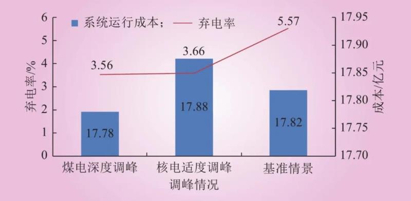 以區(qū)域電網(wǎng)典型周運(yùn)行情況為基準(zhǔn)情景,構(gòu)建核電適度調(diào)峰情景(即基準(zhǔn)情景下允許核電以80%額定功率進(jìn)行調(diào)峰)、煤電深度調(diào)峰情景(即基準(zhǔn)情景下將煤電最小技術(shù)出力由50%額定容量壓縮至40%額定功率),通過(guò)生產(chǎn)模擬分析3種情景下的系統(tǒng)成本變化及其對(duì)新能源消納的影響,結(jié)果如圖9所示。
