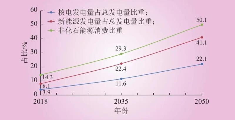 圖4為核電與新能源在能源電力消費(fèi)中的占比變化趨勢(shì),從發(fā)電量來(lái)看,非化石能源發(fā)電量增長(zhǎng)迅速,2035年,非化石能源發(fā)電量占總發(fā)電量比重超過(guò)50%,2050年達(dá)到80%左右。其中核電和新能源貢獻(xiàn)巨大,核電發(fā)電量占比由2018年的不足4%,上升至2035年的11.6%和2050年的22.1%;新能源發(fā)電量占比由2018年的8.1%,上升至2035年的22.4%和2050年的41.1%。