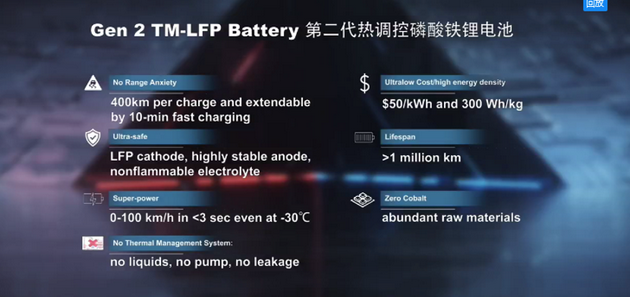第三它可以讓我們使用非燃電解液,這樣讓磷酸鐵鋰電池的安全性都更上一層樓,在繼續(xù)的研究中,我們又研發(fā)出第二代熱調(diào)控磷酸鐵鋰電池,目前在實(shí)驗(yàn)室我們已經(jīng)做到300瓦時(shí)每公斤的能量密度并成本有望降至每瓦時(shí)3毛5。新成果再加上第一代的其他優(yōu)勢(shì),例如10分鐘快充,不怕冷,還有不含鈷,鈷是戰(zhàn)略性金屬,沒(méi)有熱管理系統(tǒng),這應(yīng)該是一款幾乎接近終極的電池,可滿(mǎn)足絕大部分的應(yīng)用需求。
