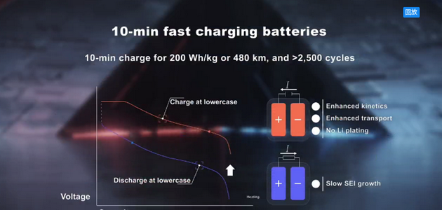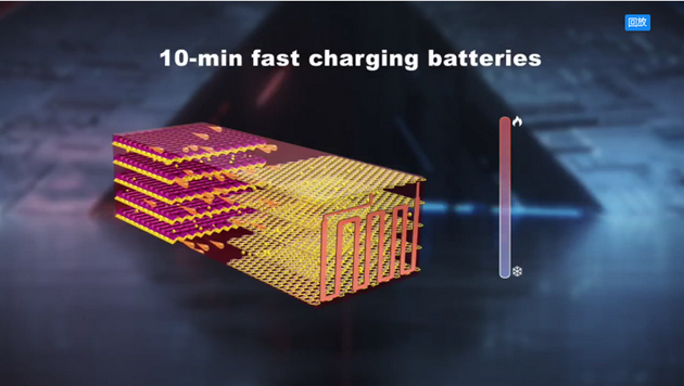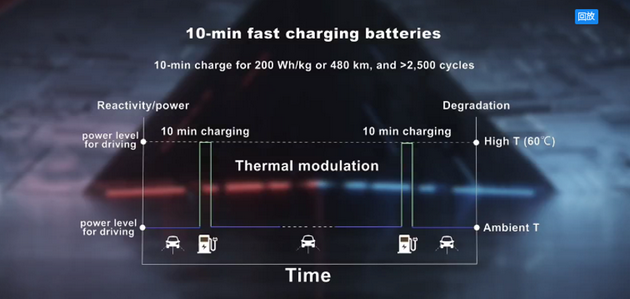 熱調(diào)控原理讓我們也發(fā)明了10分鐘快充電池,因?yàn)榭斐涞目茖W(xué)要求是電池的活性足夠高,鋰離子在兩電極之間傳遞的足夠快,而我們熱調(diào)控機(jī)理可以讓電池做到這些,所以未來(lái)當(dāng)電動(dòng)汽車(chē)來(lái)到快充樁之前,我們可以給電池來(lái)一個(gè)30秒的熱刺激,然后再在10分鐘之內(nèi)把大電流充到電池當(dāng)中。