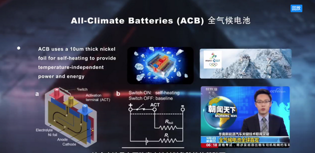 針對(duì)前面講到的低溫痛點(diǎn),我們發(fā)明了全氣候電池,這是在不改變電池材料危險(xiǎn)性的基礎(chǔ)下,也就是說(shuō)不增加電解液的可燃性,也不改變電極材料的熱穩(wěn)定性,而是在電池的內(nèi)部植入一片10微米厚度的鎳箔作為發(fā)熱體,這個(gè)厚度只有人的頭發(fā)絲的1/10,所以幾乎不增加電池的體積和重量。