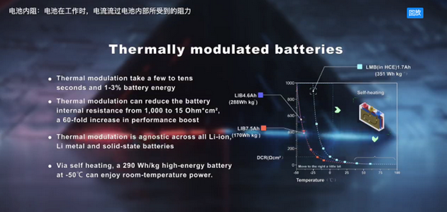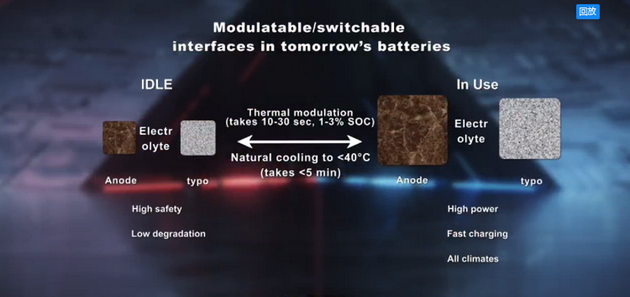在過(guò)去10多年中,我的團(tuán)隊(duì)一直在尋找和探索這種可調(diào)控界面的電池,確實(shí)我們找到了一種熱調(diào)控的方法,利用瞬間熱刺激,大概需要10~30秒鐘消耗1%~3%的電量,我們就可以把電化學(xué)界面調(diào)大調(diào)強(qiáng)。有了這個(gè)快捷低能耗的熱刺激方法,我們就可以用最穩(wěn)定最安全的材料制作電池,在不使用的時(shí)候電池內(nèi)的化學(xué)界面當(dāng)然是保持最低的水平,保障了電池的絕對(duì)安全和最低的老化速率。而工作的時(shí)候,用熱刺激可以把電池里的反應(yīng)界面瞬間調(diào)大調(diào)強(qiáng)來(lái)提供高功率快充能力,甚至是在任何低溫環(huán)境中都有非常良好的性能,等到電池工作完了,自然冷卻可以在5分鐘內(nèi)把電池溫度降到40度以下,這樣電池回到它的原始狀況,是安全的穩(wěn)定的或者說(shuō)是低調(diào)的。