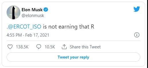 特斯拉CEO埃隆·馬斯克(Elon Musk)當時在推特上批評得州的電力運營商“沒有R”——R是得州電力可靠性委員會(Electric Reliability Council of Texas)中Reliability的縮寫,意指得州電網供電可靠性不足。馬斯克本人在2020年12月從加州搬到了得州,并且陸續(xù)將很多業(yè)務也搬到得州,包括在得州首府奧斯汀附近建設新的特斯拉超級工廠,在博卡奇卡建設SpaceX發(fā)射場。