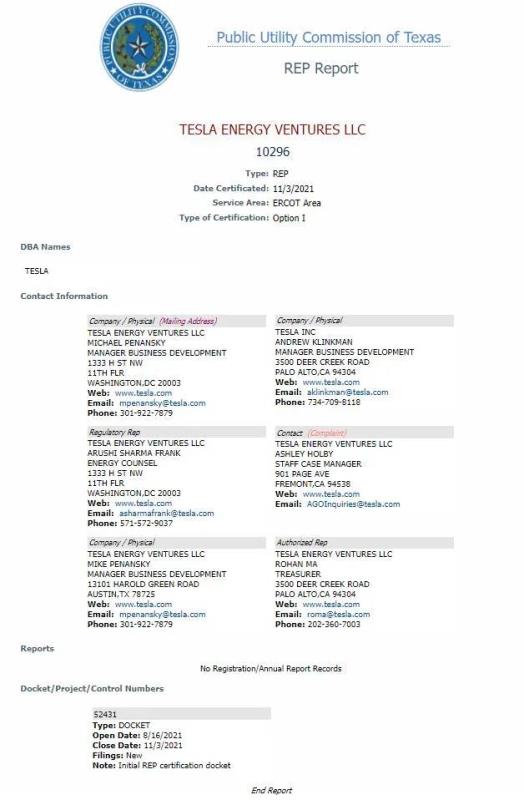 特斯拉的全資子公司——特斯拉能源風險投資公司(Tesla Energy Ventures)在2021年8月中旬向美國得州公用事業(yè)委員會(Public Utility Commission of Texas)提交了在該州銷售電力的申請。11月初,得州公用事業(yè)委員會批準了特斯拉的運營申請。得州公用事業(yè)委員會的網站顯示,特斯拉能源風險投資公司現在被許可在ERCOT(得州電力可靠性委員會)服務的整個地區(qū)提供零售電力服務。