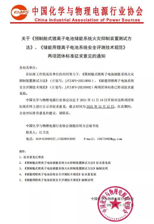 在標(biāo)準(zhǔn)工作組成員單位的共同努力下,《預(yù)制艙式鋰離子電池儲(chǔ)能系統(tǒng)火災(zāi)抑制裝置測(cè)試方法》(計(jì)劃號(hào):J/CIAPS-20210001)、《儲(chǔ)能用鋰離子電池系統(tǒng)安全評(píng)測(cè)技術(shù)規(guī)范》(計(jì)劃號(hào):J/CIAPS-20210002)兩項(xiàng)團(tuán)體標(biāo)準(zhǔn)已形成征求意見稿。