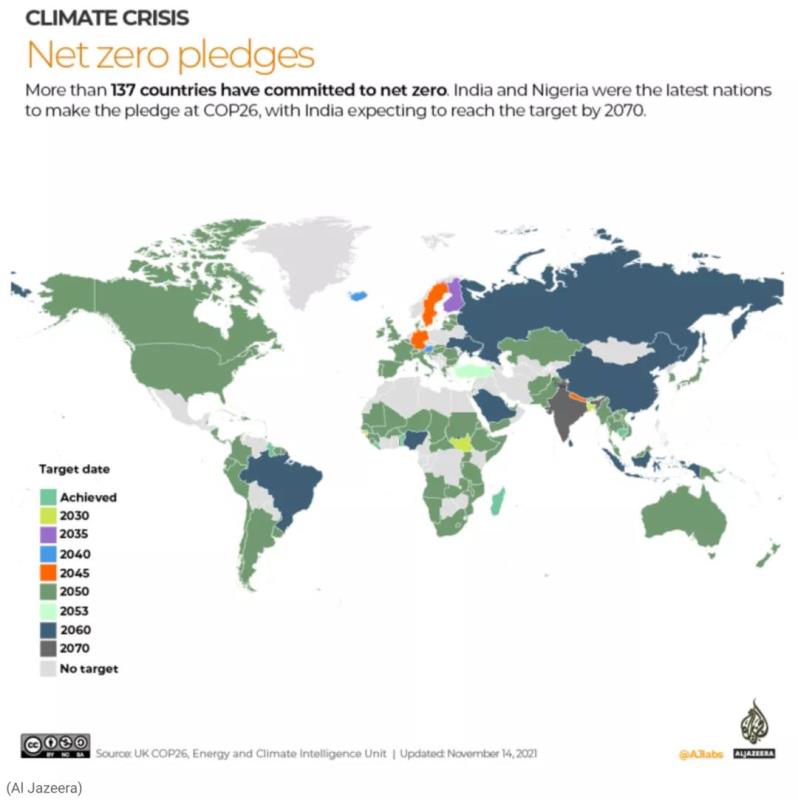 中國儲(chǔ)能網(wǎng)訊:為了保持目標(biāo)在可實(shí)現(xiàn)范圍內(nèi),到2030年全球排放量需要比2010年減少45%。為此,在COP26上各國為應(yīng)對(duì)氣候變化作出了新的承諾。半島電視臺(tái)制作了圖表,綜述各國在停止砍伐森林、逐步淘汰煤炭、減少甲烷排放、凈零排放的承諾。