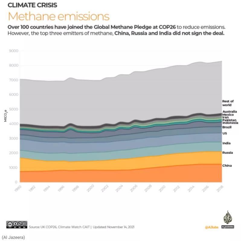 甲烷是比二氧化碳更強(qiáng)大的溫室氣體,因?yàn)樗茉诖髿庵行顭?。然而,甲烷排放量最大的三個(gè)國家——中國、俄羅斯和印度——沒有簽署甲烷減排承諾。