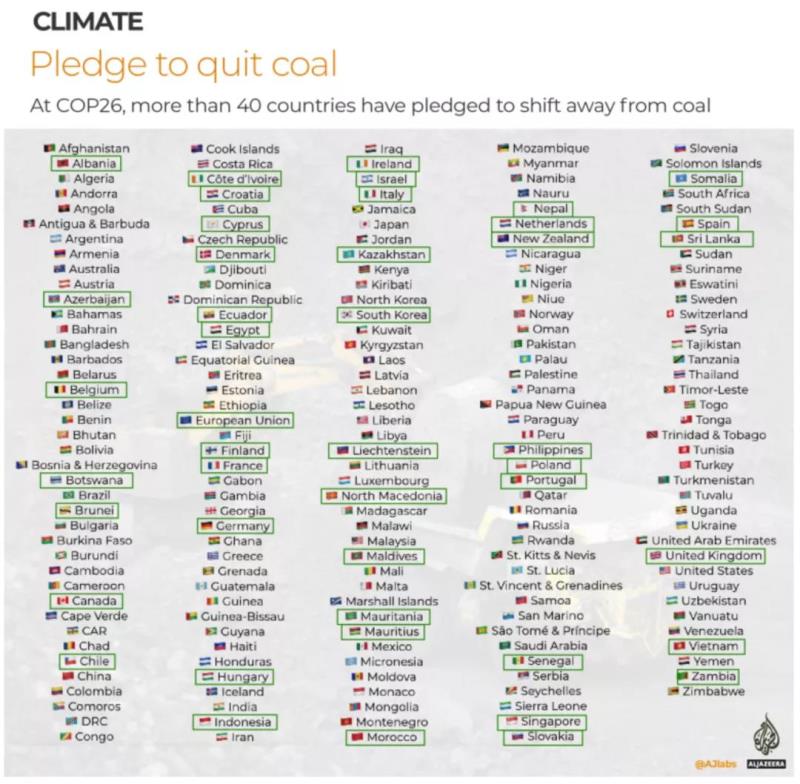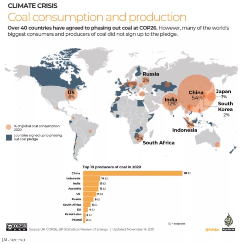 全球40多個(gè)國家同意逐步停止使用煤電,23個(gè)國家簽署了COP26煤電向清潔能源過渡協(xié)議,承諾停止建設(shè)和發(fā)放新煤電廠的許可證,主要國際銀行還承諾在2021年底前結(jié)束對(duì)新煤電的國際公共融資。然而,一些最大的煤炭生產(chǎn)國和消費(fèi)國沒有加入該協(xié)議,包括中國(去年占全球煤炭消費(fèi)量的54%)。其他明顯缺席的國家還有印度、美國和澳大利亞,它們與中國一起占全球煤炭消費(fèi)量的近四分之三。
