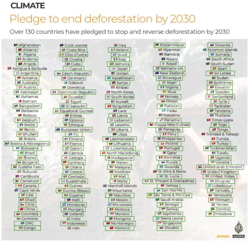 140多個(gè)國家同意在未來十年內(nèi)停止全球森林砍伐。該協(xié)議是峰會(huì)達(dá)成的第一項(xiàng)重大協(xié)議,包括192億美元的公共和私人資金承諾。簽署國中有俄羅斯和巴西,這兩個(gè)國家占世界森林面積的30%以上。但印度、玻利維亞和委內(nèi)瑞拉沒有參加該協(xié)議,它們都屬于森林覆蓋土地面積比例最大的前20個(gè)國家。
