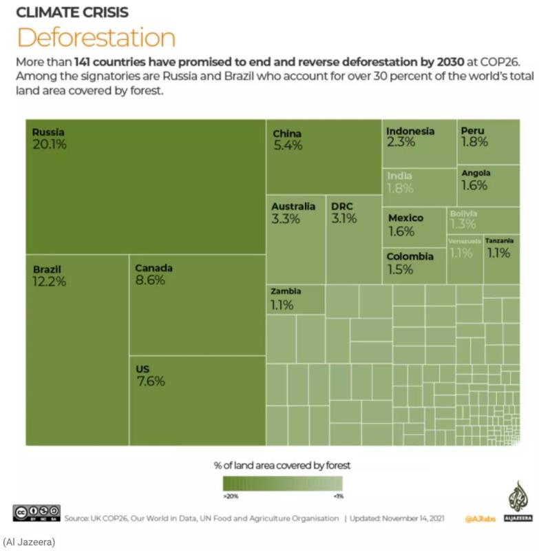 由于森林中儲(chǔ)存的碳被釋放回大氣,土地清理導(dǎo)致溫室氣體排放。COP26領(lǐng)導(dǎo)人通過森林和土地利用的宣言,旨在保護(hù)和恢復(fù)森林。