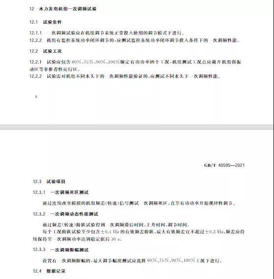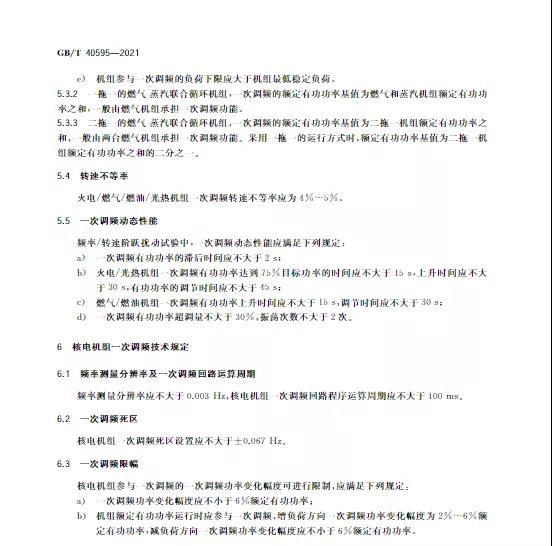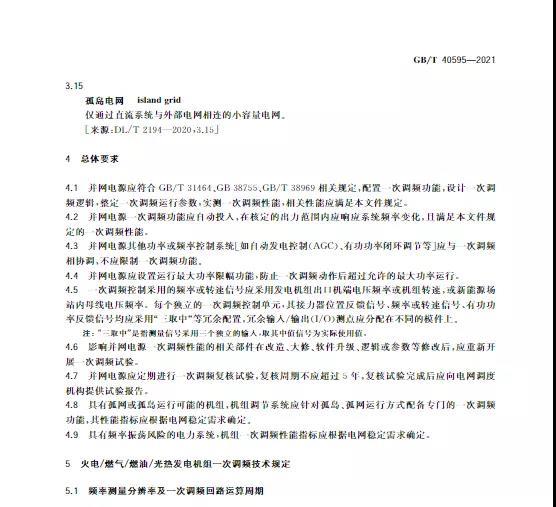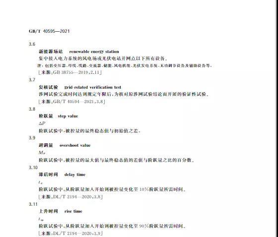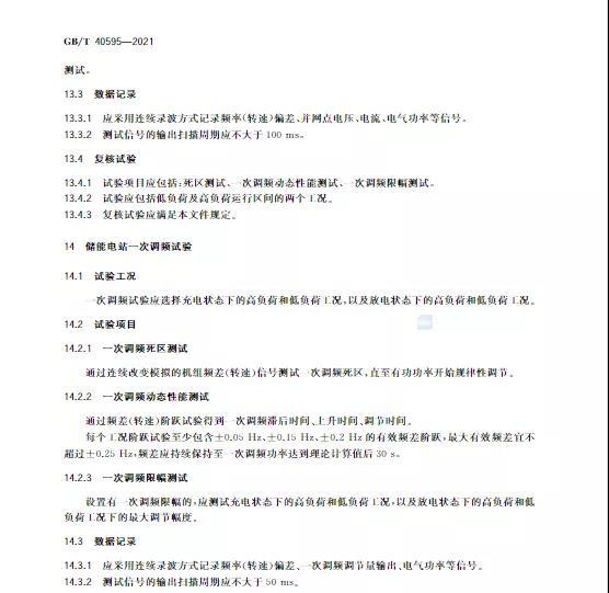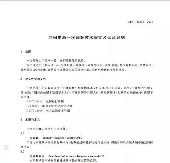 中國(guó)儲(chǔ)能網(wǎng)訊:10月11日,國(guó)家標(biāo)準(zhǔn)《并網(wǎng)電源一次調(diào)頻技術(shù)規(guī)定及試驗(yàn)導(dǎo)體》GB/T 40595-2021正式發(fā)布并且于2022年5月1日起正式實(shí)施。文件明確:接入35kV及以上電壓等級(jí)的儲(chǔ)能電站、風(fēng)電、光伏等并網(wǎng)電源要按照該文件執(zhí)行。其中儲(chǔ)能電站一次調(diào)頻動(dòng)態(tài)性能應(yīng)滿足下列規(guī)定: