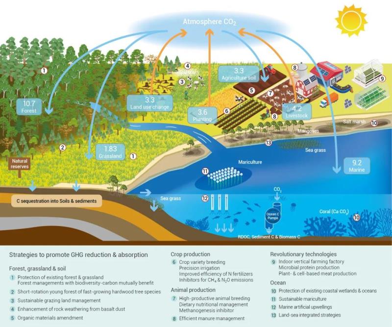 Fig. 3 Overview of global GHG budget and strategies to promote GHG reduction and sequestration in global ecosystems