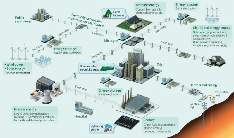對(duì)標(biāo)碳中和,實(shí)現(xiàn)一次能源有序減量替代,需大力發(fā)展可再生能源??稍偕茉词且粋€(gè)完整的技術(shù)體系,不僅需要太陽能、風(fēng)能、地?zé)崮?、海洋能等,更需要?chǔ)能技術(shù)的配合,形成真正的新能源體系。核能與氫能具有清潔低碳、綠色環(huán)保等優(yōu)點(diǎn),是實(shí)現(xiàn)碳中和目標(biāo)的重要技術(shù);生物質(zhì)能也是實(shí)現(xiàn)能源結(jié)構(gòu)調(diào)整的重要支撐。本文總結(jié)了可再生能源大規(guī)模應(yīng)用中的關(guān)鍵核心技術(shù),以及這些關(guān)鍵核心技術(shù)對(duì)實(shí)現(xiàn)碳中和目標(biāo)的影響,同時(shí)對(duì)這些技術(shù)未來的發(fā)展進(jìn)行了展望(圖2)。