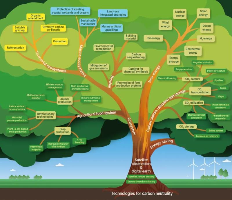 (1) To realize orderly reduction and replacement of fossil fuel energy sources with renewable energy sources, we need to vigorously develop energy storage systems to address the intermittency of renewable energy sources. (2) To coordinate ecosystem protection and carbon sequestration, we need to push forward reform of crop-livestock production systems based on land use and improving ecological carbon sink. (3) To integrate ecological strategies optimizing biochar production, life cycle analysis, and formulate standards to advance the development of green and low-carbon industries. (4) To adopt breakthrough CCUS technologies including polygeneration, chemical looping combustion, and fossil fuels combined with renewable energy for CO2 capture, to overcome the high energy consumption and high costs. (5) To develop new satellites to comprehensively and timely monitor GHG emissions, and to expand the ability to calculate C budgets through joint observation from space and the ground.