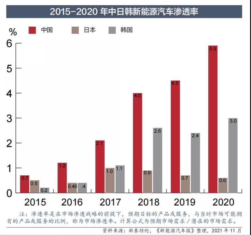 有數(shù)據(jù)顯示,2015年,中國(guó)新能源汽車滲透率為0.7%,韓國(guó)為0.2%,日本為0.5%;而到2020年,中國(guó)新能源汽車滲透率升為5.9%,韓國(guó)為3.0%,日本為0.9%,位居倒數(shù)第一。
