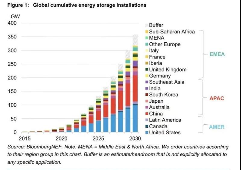 其中,美國和中國是最大的兩個市場,在2030年底前將占全球累計裝機(jī)容量的一半以上(54%)。