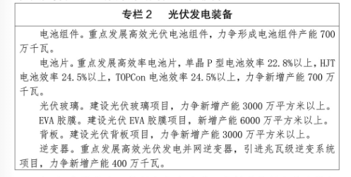 (二)光伏發(fā)電裝備。依托光伏材料產(chǎn)業(yè)優(yōu)勢(shì),鼓勵(lì)多晶硅、單晶硅企業(yè)延伸產(chǎn)業(yè)鏈條,發(fā)展下游電池片、電池組件。積極引進(jìn)光伏玻璃、背板、EVA膠膜、逆變器等項(xiàng)目,打造光伏制造全產(chǎn)業(yè)鏈,填補(bǔ)光伏裝備及配套產(chǎn)業(yè)空白,力爭(zhēng)形成與新增新能源裝機(jī)規(guī)模相匹配的光伏裝備制造生產(chǎn)能力。