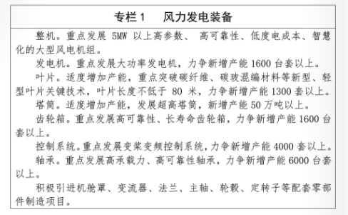 (一)風(fēng)力發(fā)電裝備。加快現(xiàn)有產(chǎn)能升級(jí)改造,優(yōu)化產(chǎn)品結(jié)構(gòu),提升整機(jī)產(chǎn)能利用率。適度發(fā)展風(fēng)電整機(jī)制造,重點(diǎn)發(fā)展葉片、發(fā)電機(jī)、增速機(jī)、輪轂、主軸、定轉(zhuǎn)子、法蘭、軸承、控制系統(tǒng)等核心配套零部件,提高零部件區(qū)內(nèi)配套能力,著力打造風(fēng)電裝備制造全產(chǎn)業(yè)鏈基地,基本形成與自治區(qū)新增新能源裝機(jī)規(guī)模相匹配的風(fēng)電裝備生產(chǎn)能力,努力建設(shè)我國(guó)北方重要的風(fēng)力發(fā)電裝備制造基地。