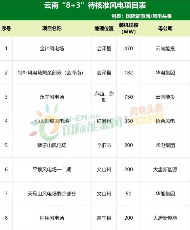 以上項目均為列入云南省“8+3”計劃中風(fēng)電項目。除了以上項目外,仍有2402MW項目待核準(zhǔn),開發(fā)商包括華電、華能、大唐、云南能投、協(xié)合風(fēng)電等。