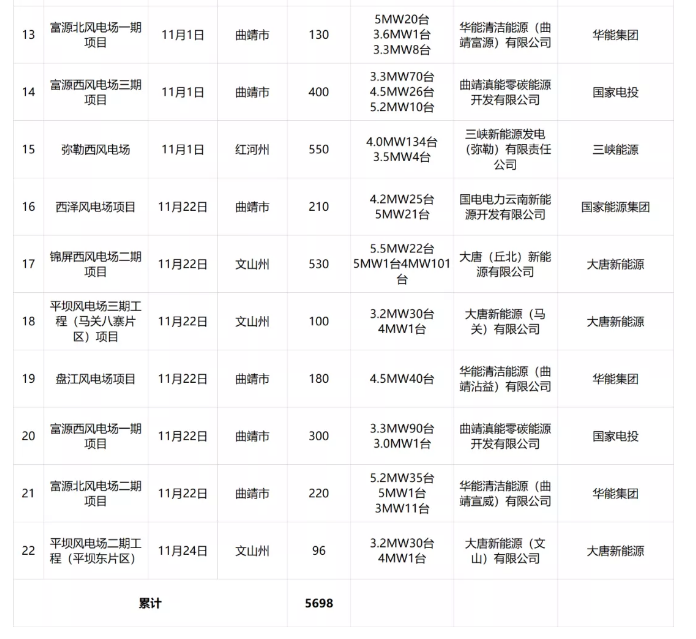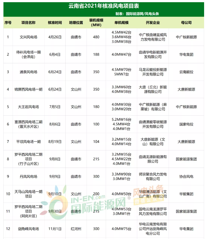 云南省2021年核準(zhǔn)風(fēng)電項目如下: